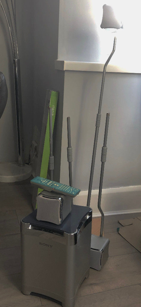 Sony DTS AV Surround Sound complete with 4 satellite speakers, 1 sub-woofer and 1 central speaker. The 4 satellite speakers all have stands complete with cables.